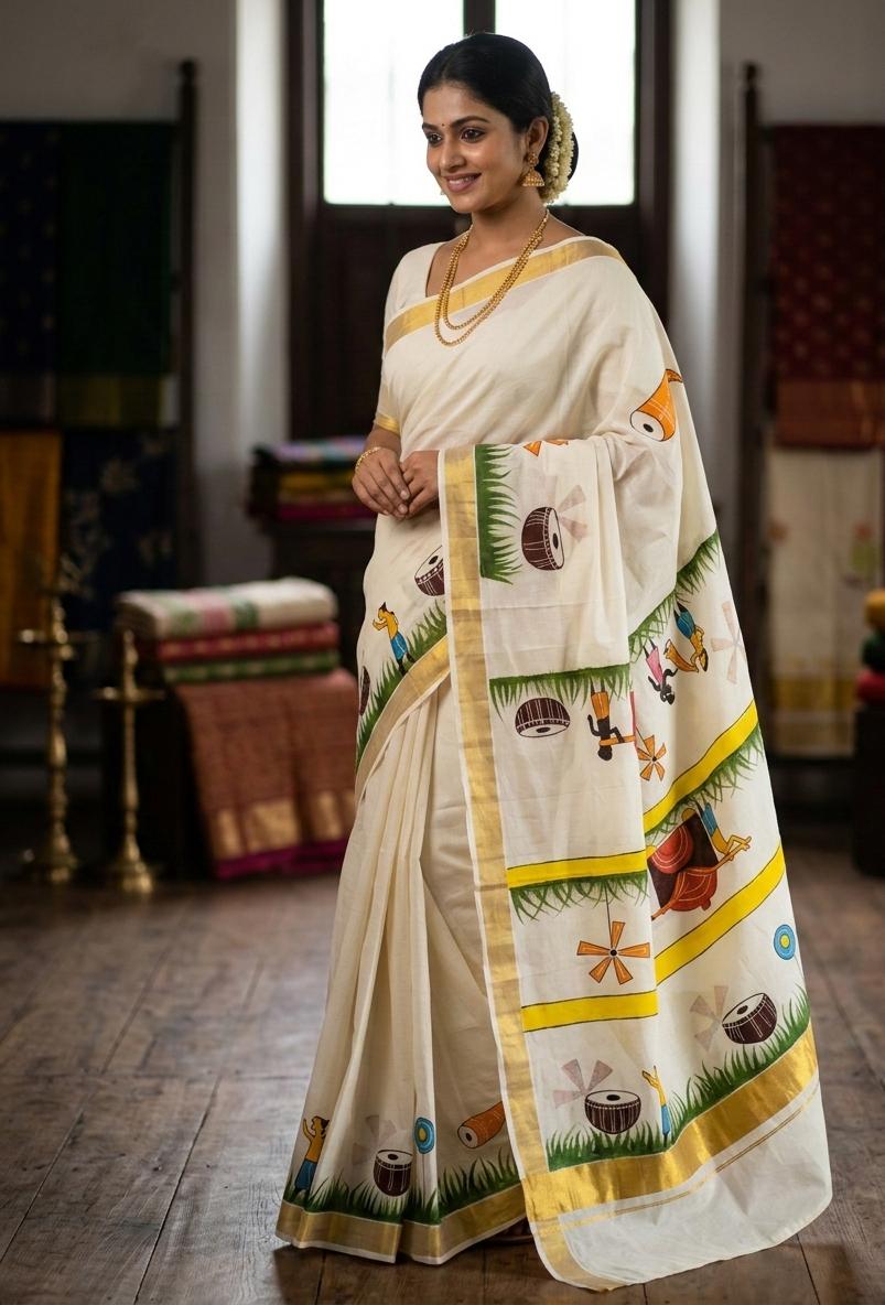 Kerala Mural Print Gold Border Saree