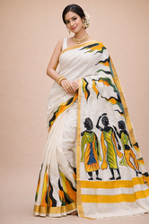 Celebrate tradition in style with this elegant ivory saree featuring a classic golden border and stunning tribal art-inspired prints. The artistic pallu design adds a unique cultural charm, making it perfect for festivals, cultural events, and special occasions.