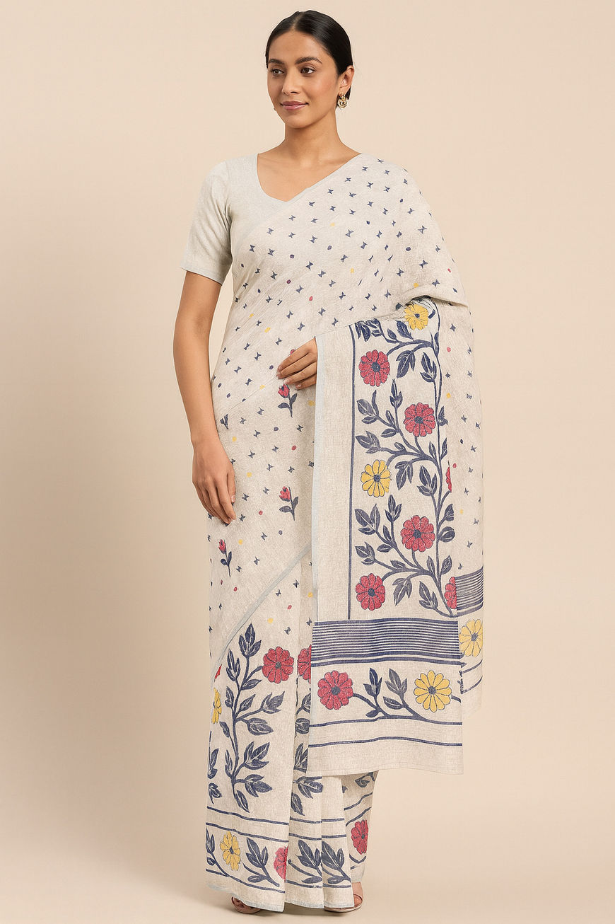 Bring a breath of fresh air to your ethnic wardrobe with the Sunlit Meadow Hand-Block Printed Cotton Saree. Expertly block-printed on a breathable cotton base, the saree showcases delicate floral sprigs across the body and a stylised floral border in soothing blue, red and yellow tones. The natural, muted beige background and artisanal print make it ideal for daytime events, office ethnic wear, summer outings and relaxed festive occasions.