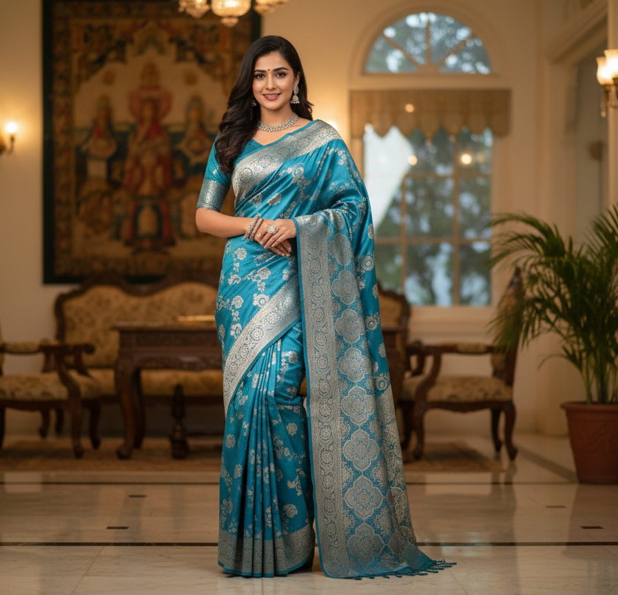 This Satin Jal Banarasi saree features an elegant all-over jal pattern woven with fine silver zari on a rich satin base. Its smooth texture and graceful shine make it a perfect choice for festive occasions, weddings, and special celebrations.